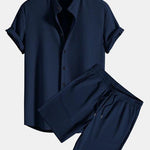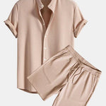 Este conjunto de dos piezas combina una elegante camisa de manga corta con pantalón a juego de corte holgado, confeccionados en una mezcla de algodón transpirable con un interior de tacto sedoso. Diseñado para ofrecer elegancia cotidiana y comodidad en cada fibra.