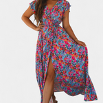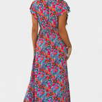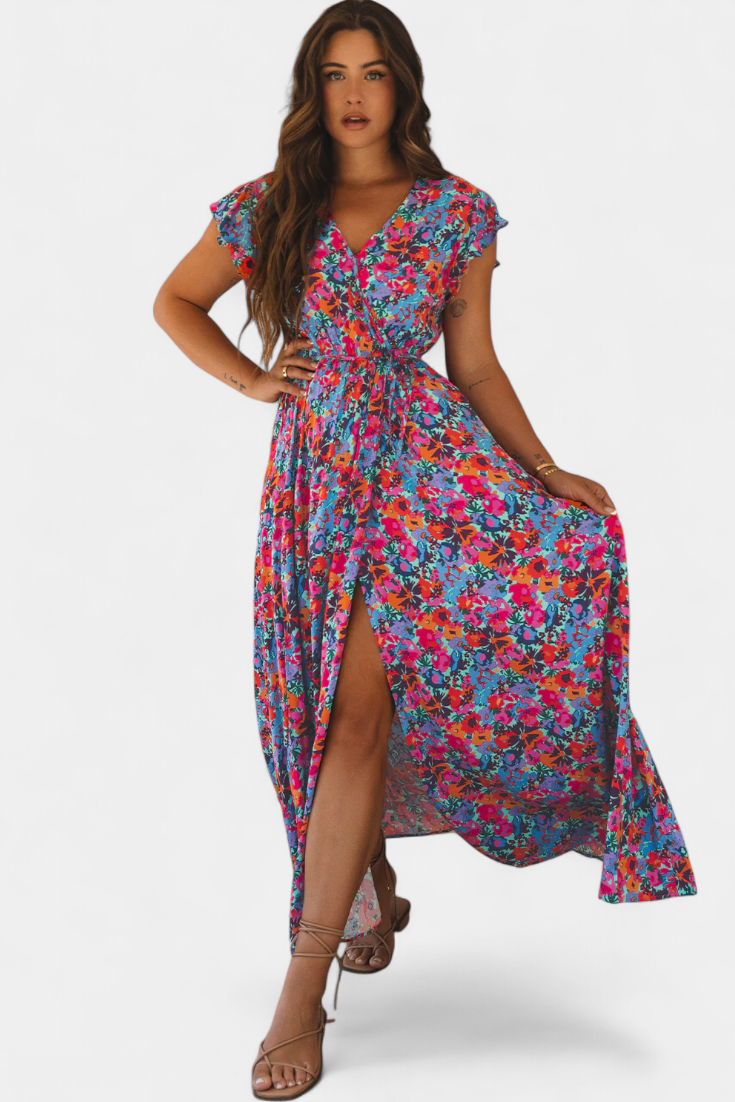 Fresco, envolvente y vibrante. El vestido Patricia combina una silueta cruzada con una falda amplia y abertura lateral para lograr una estética femenina con libertad de movimiento. El estampado floral multicolor aporta energía y vitalidad, ideal para destacar con gracia en días soleados o momentos especiales sin esfuerzo.
